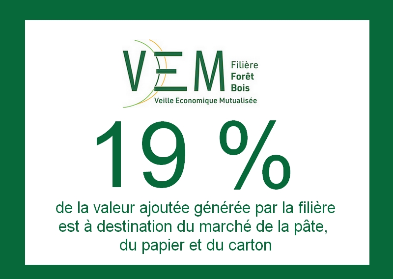 En 2023, la part de valeur ajoutée à destination du marché de la pâte, du papier et du carton représente 19 % de la valeur ajoutée totale de la filière forêt-bois française