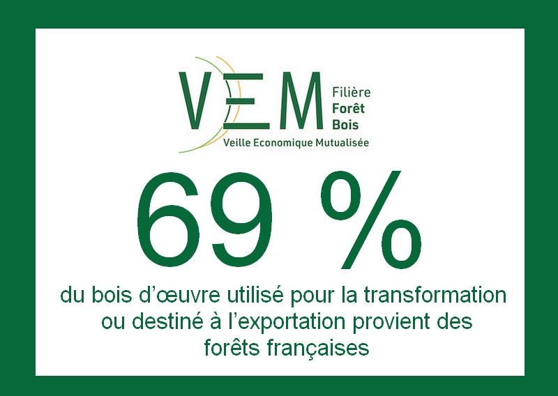 En 2023, 69 % du bois d’œuvre (en volume) utilisé pour la transformation ou destiné à l’exportation provient des forêts françaises.