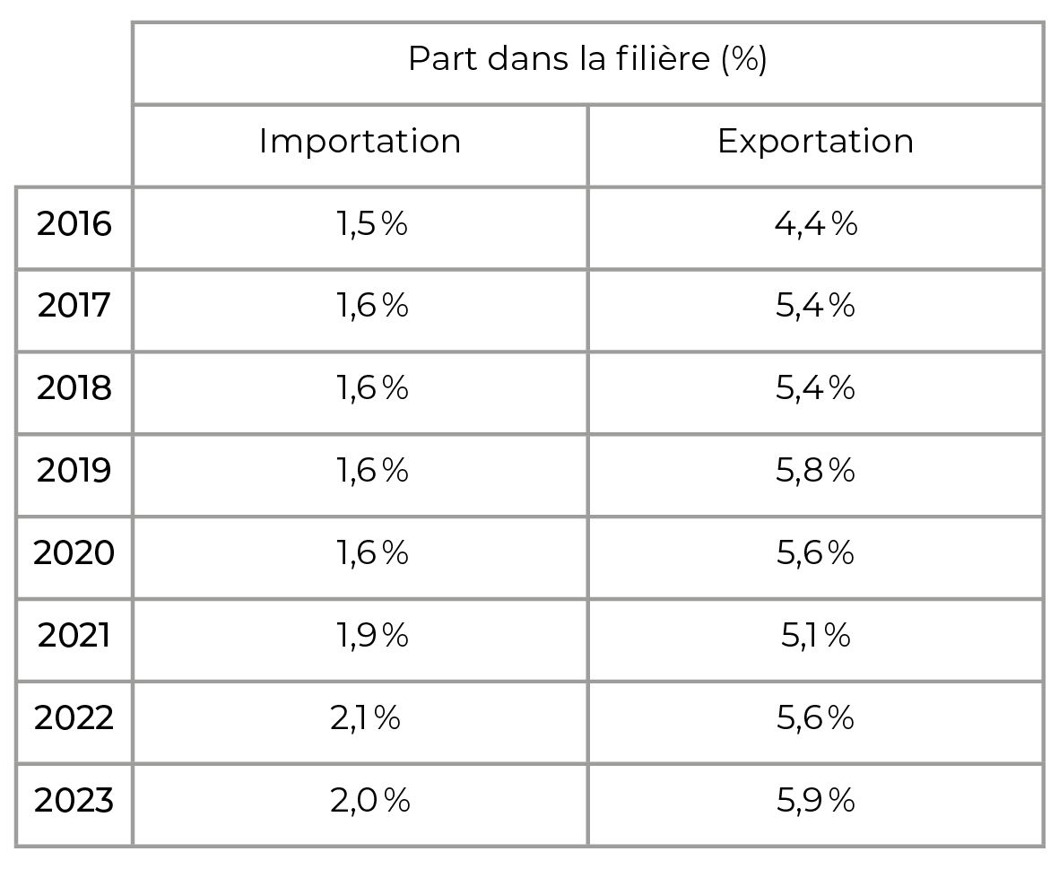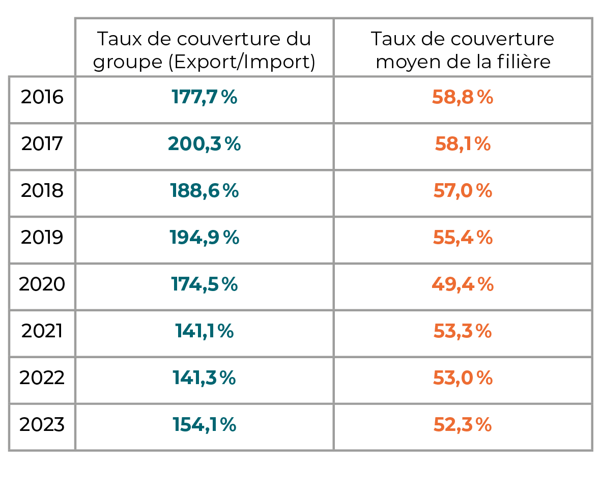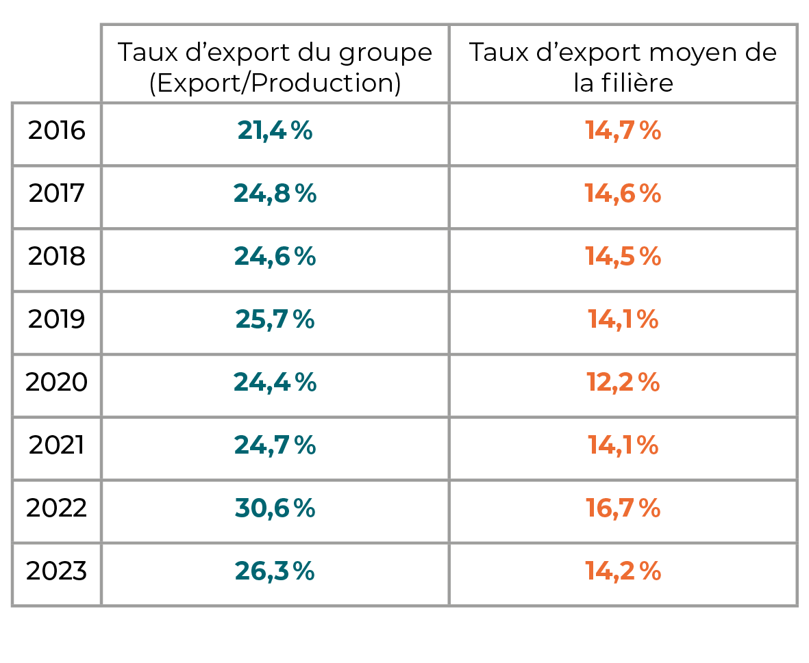 Le taux d’export est le ratio export sur production. Il met en évidence la propension à exporter du groupe. Le taux d’export n’est pas pertinent pour les commerces qui sont considérés comme un intermédiaire.