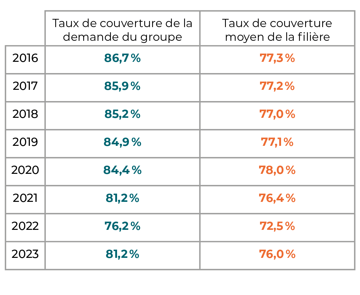 Le taux de couverture de la demande par l’offre nationale indique la part du marché intérieur couverte par la production nationale. Par exemple, si le taux d’import est de 20% alors le taux de couverture de la demande par l’offre nationale est de 80%.