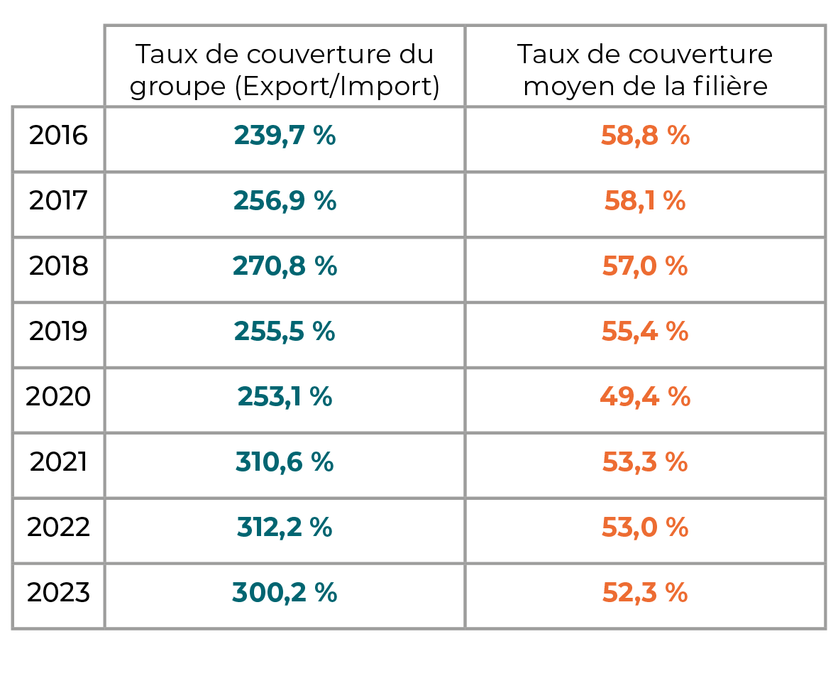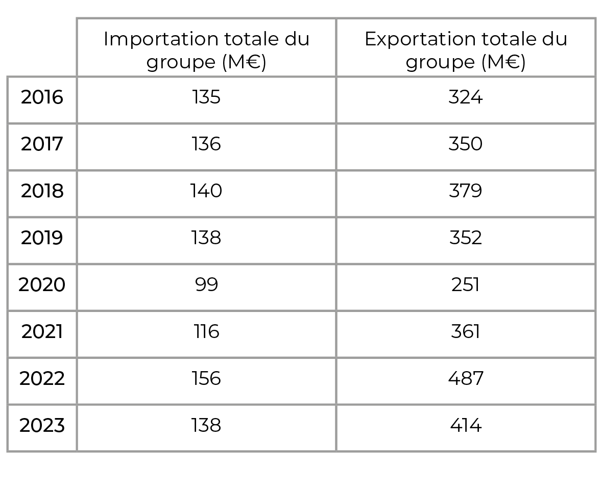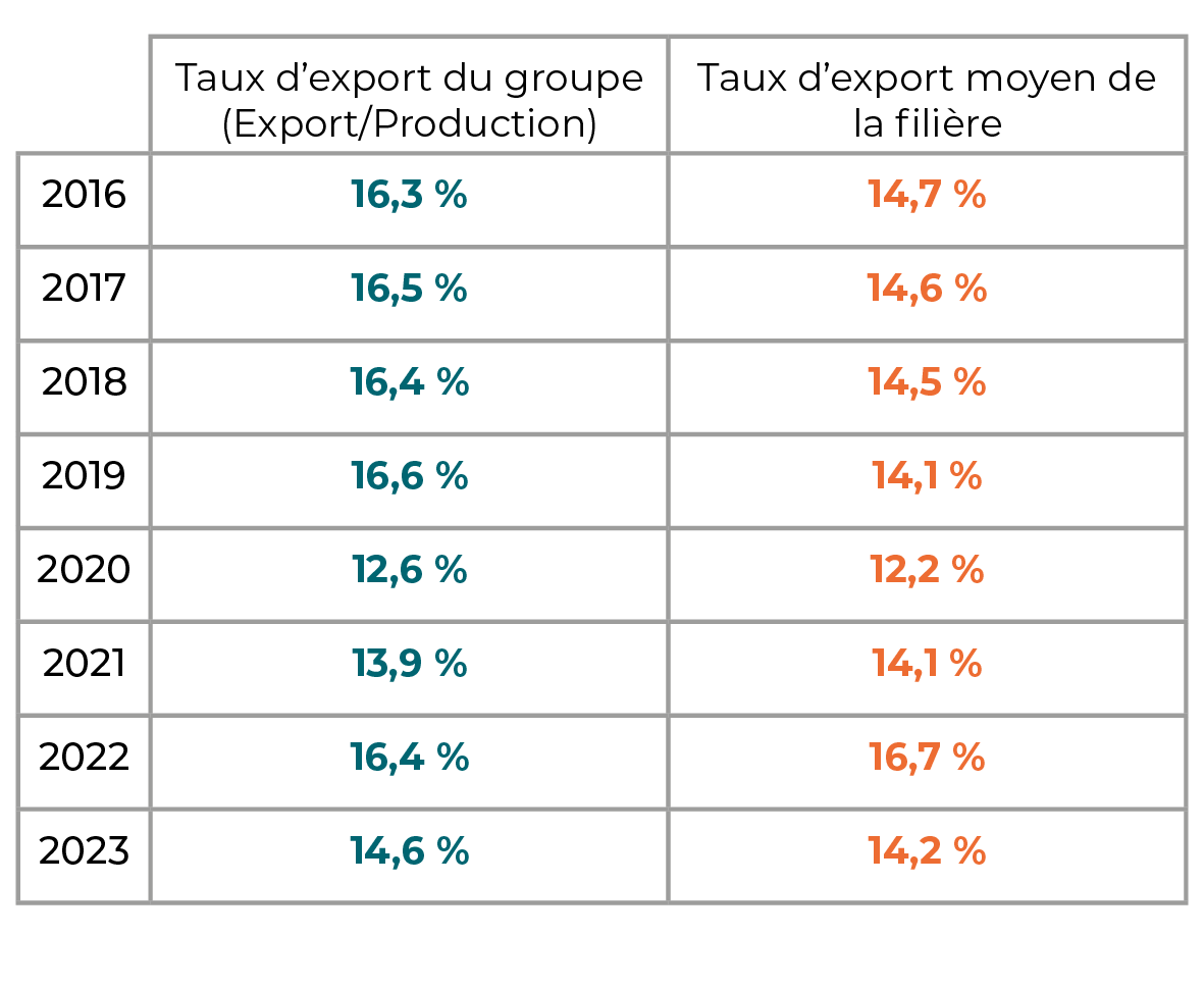 Le taux d’export est le ratio export sur production. Il met en évidence la propension à exporter du groupe. Le taux d’export n’est pas pertinent pour les commerces qui sont considérés comme un intermédiaire.