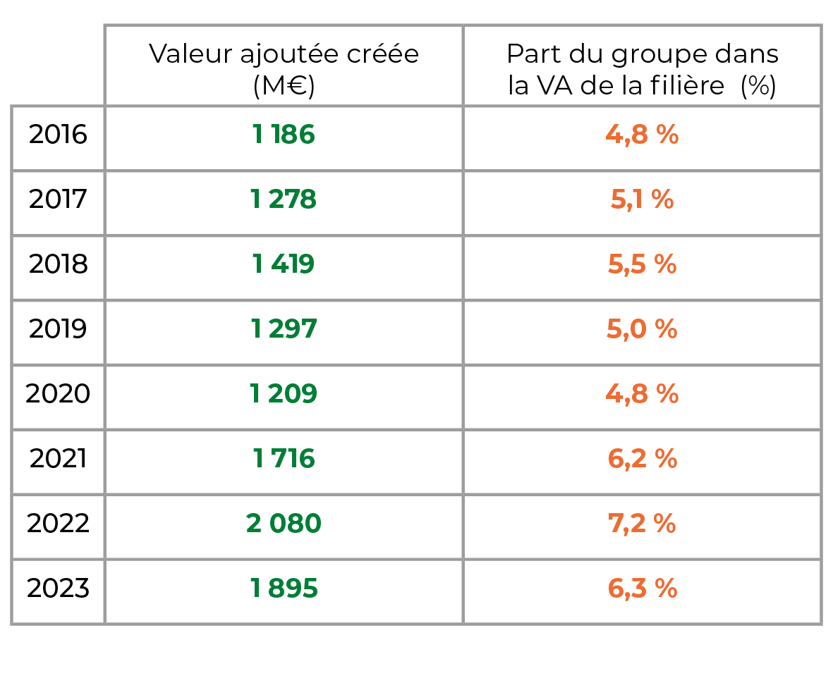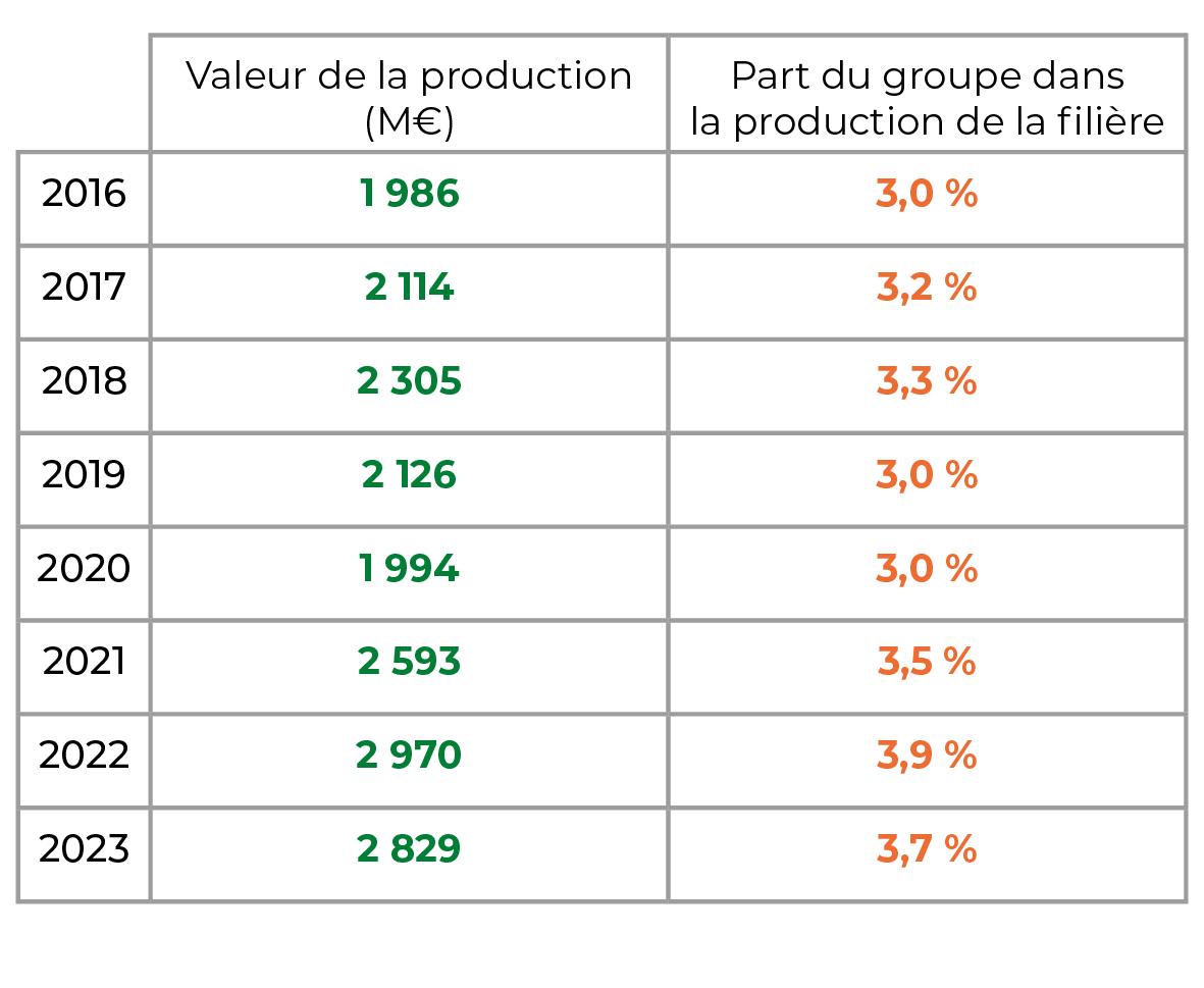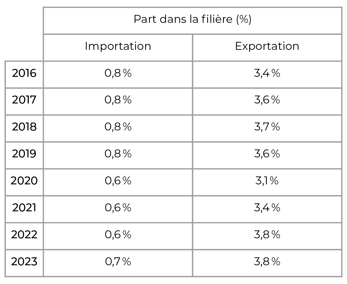 Le taux d’export est le ratio export sur production. Il met en évidence la propension à exporter du groupe. Le taux d’export n’est pas pertinent pour les commerces qui sont considérés comme un intermédiaire.