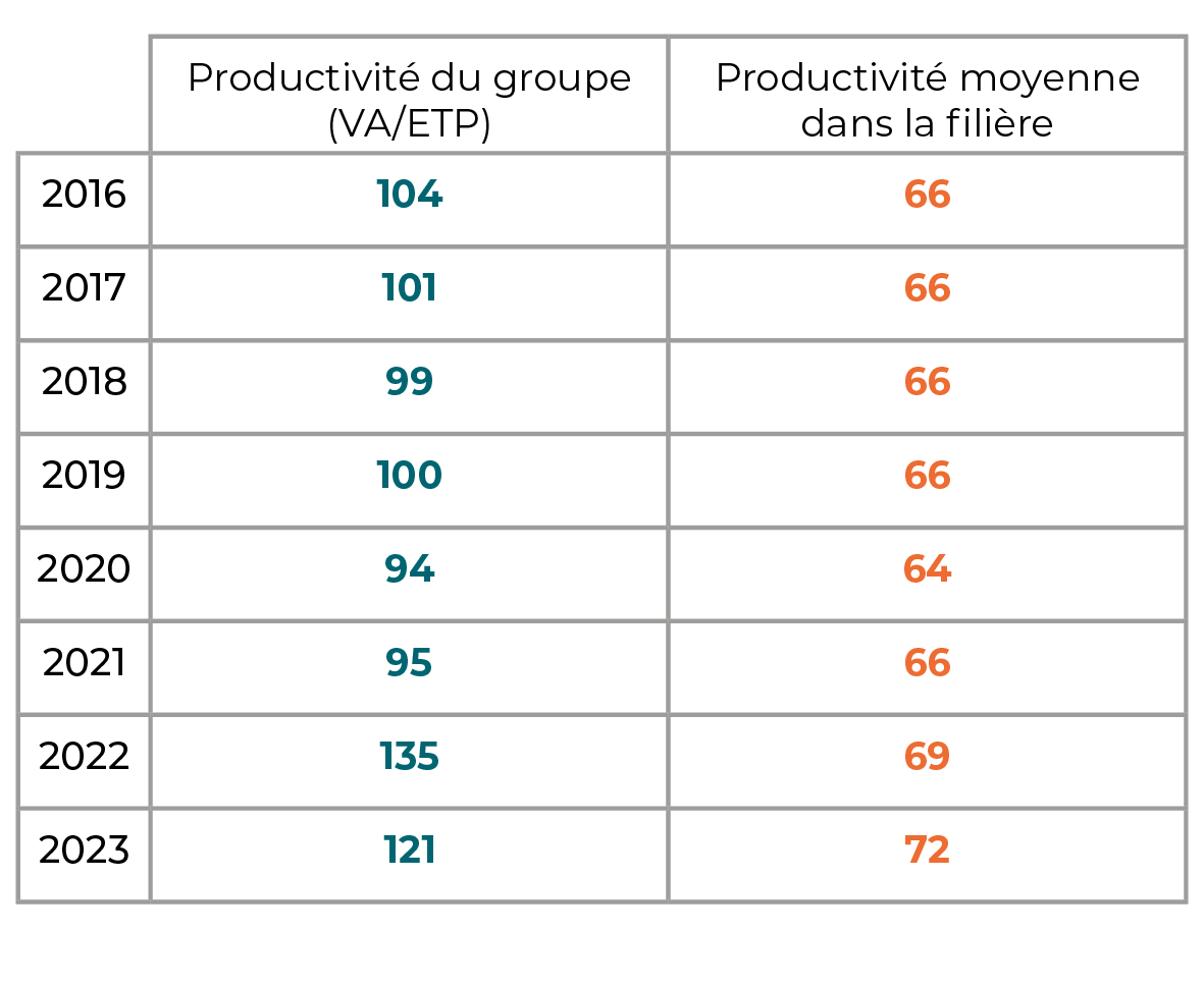 La forte productivité apparente du travail (VA/ETP) de ce groupe provient de la particularité de la production de bois. En effet, ne sont recensés en ETP que les propriétaires forestiers privés « professionnels », bien moins nombreux que l’ensemble des propriétaires dont la production de bois n’est pas la profession principale.