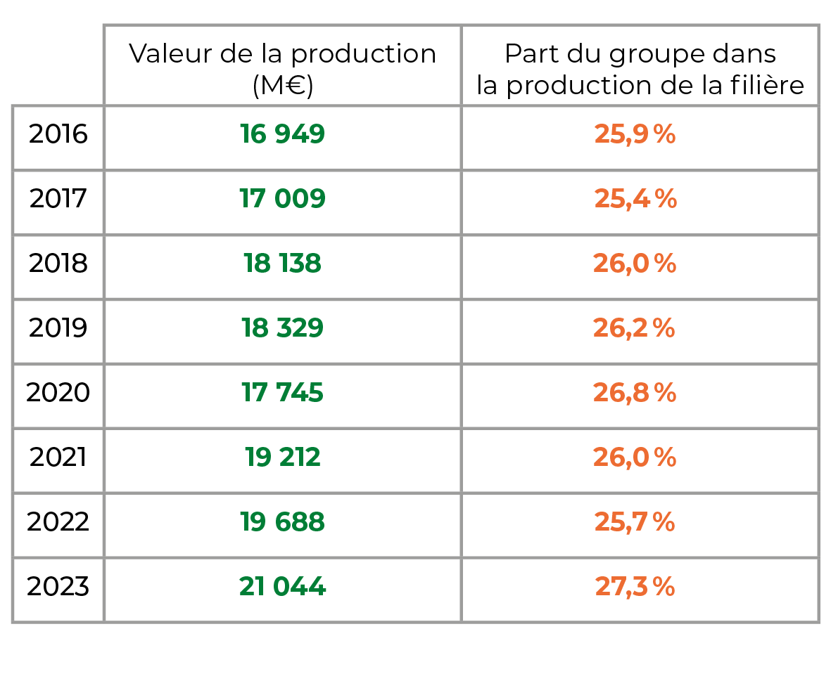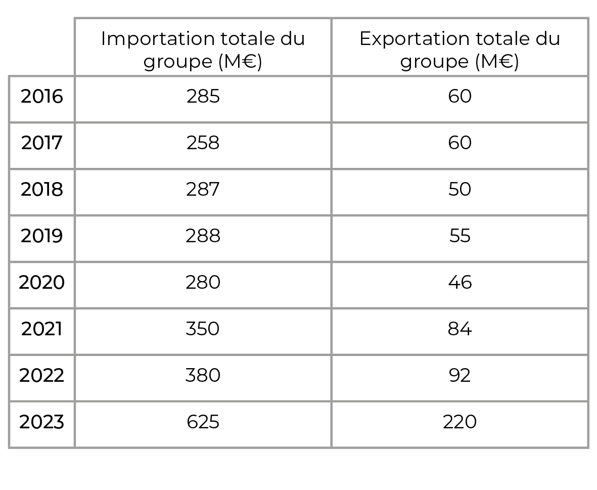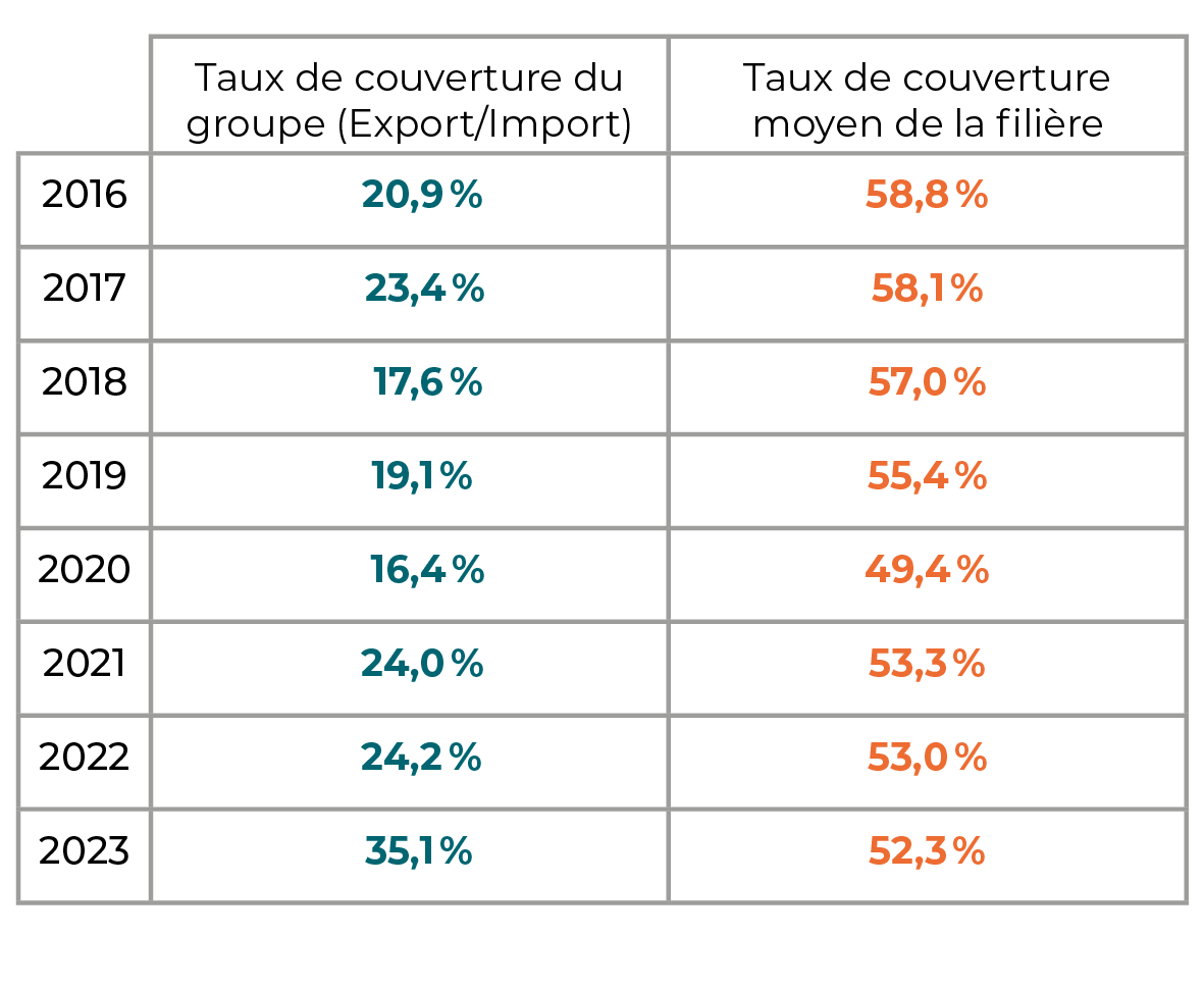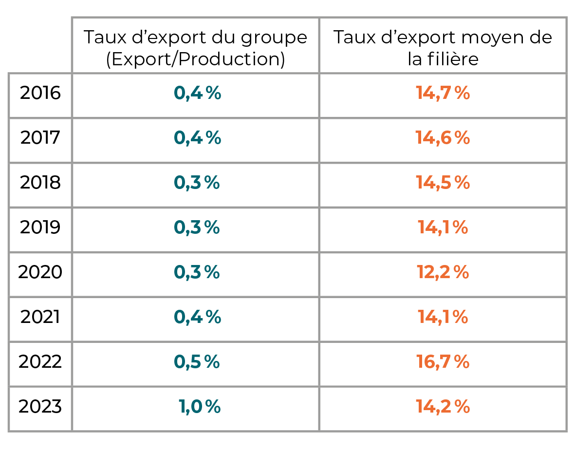 Le taux d’export est le ratio export sur production. Il met en évidence la propension à exporter du groupe. Le taux d’export n’est pas pertinent pour les commerces qui sont considérés comme un intermédiaire.
