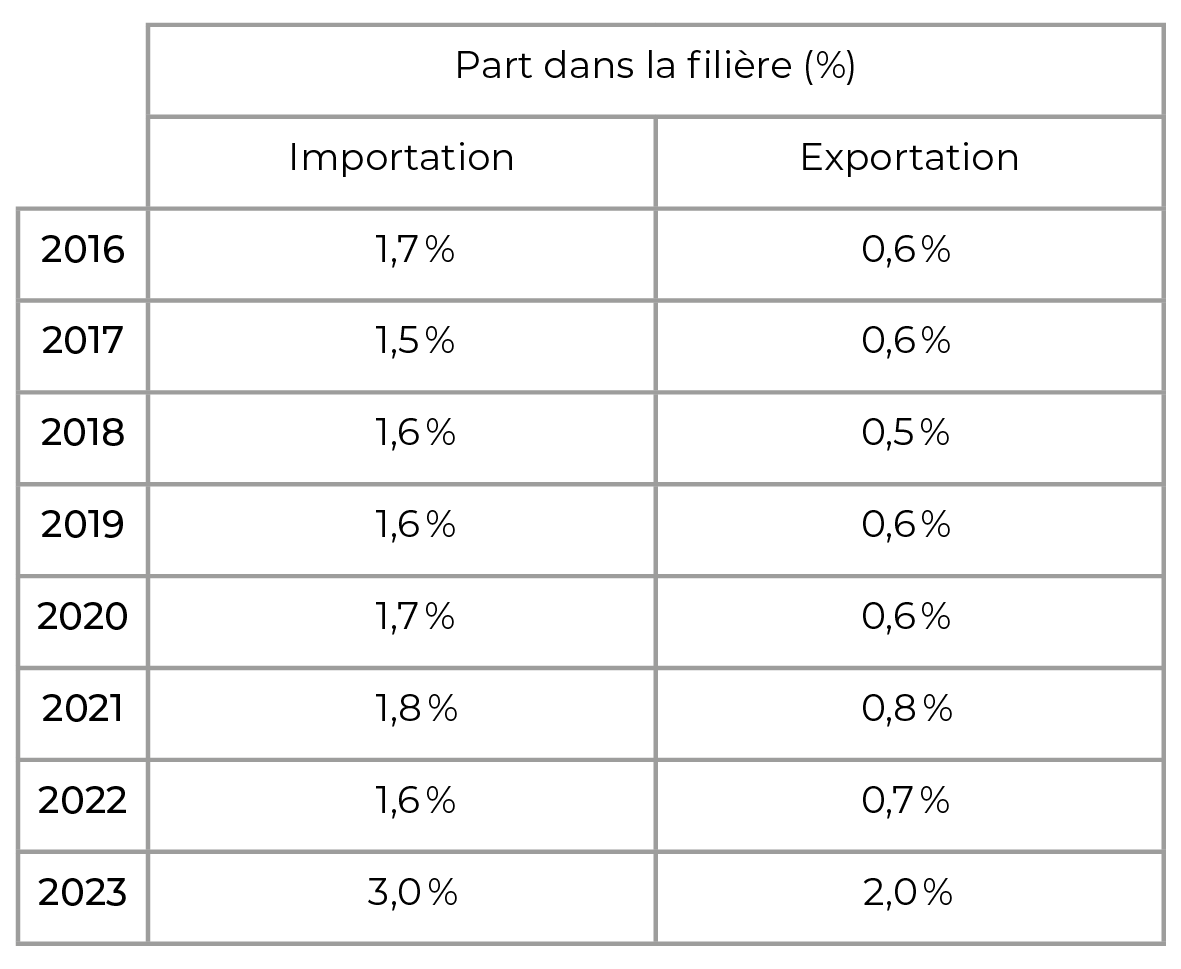 Le taux de couverture de la demande par l’offre nationale indique la part du marché intérieur couverte par la production nationale. Par exemple, si le taux d’import est de 20% alors le taux de couverture de la demande par l’offre nationale est de 80%.