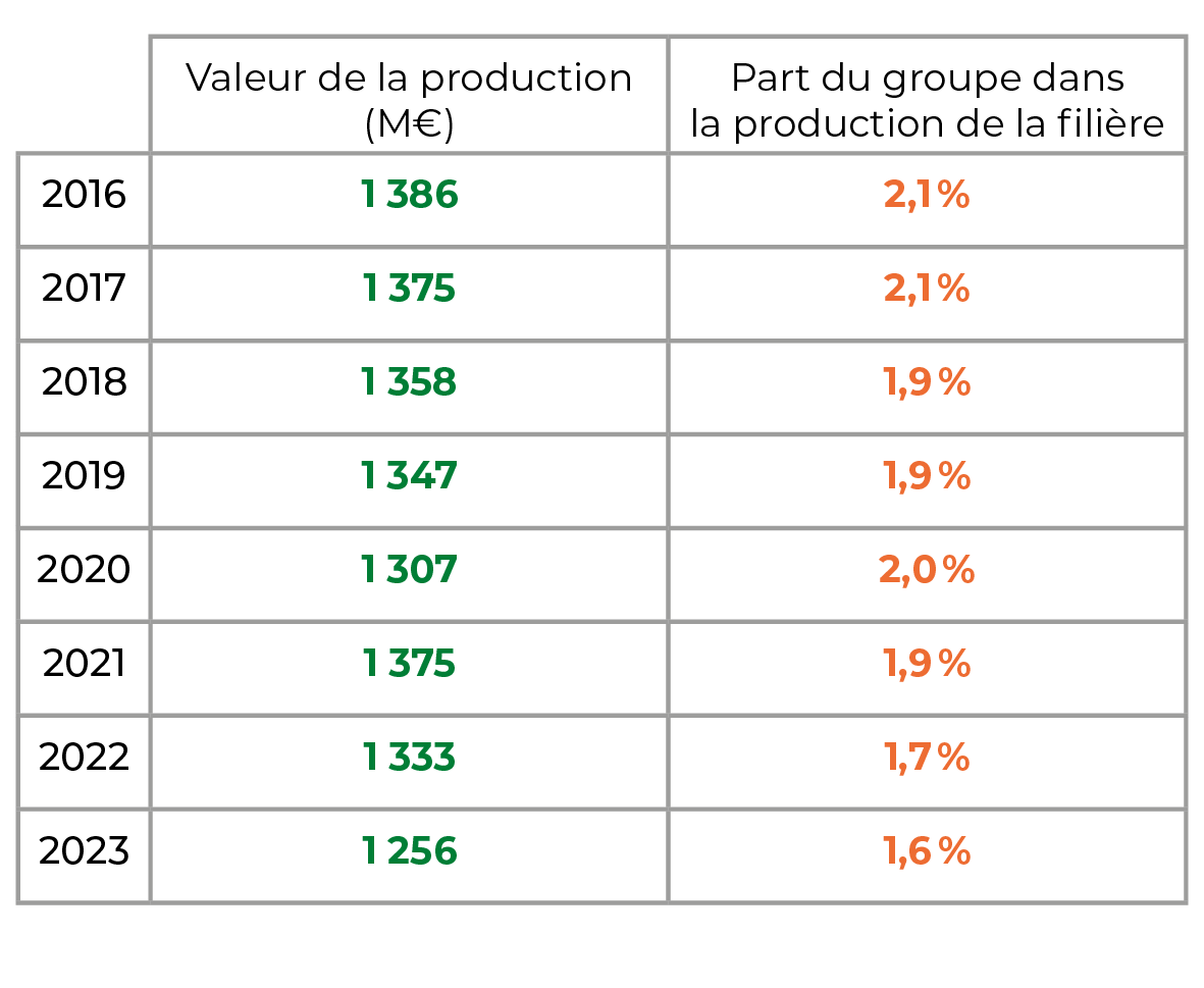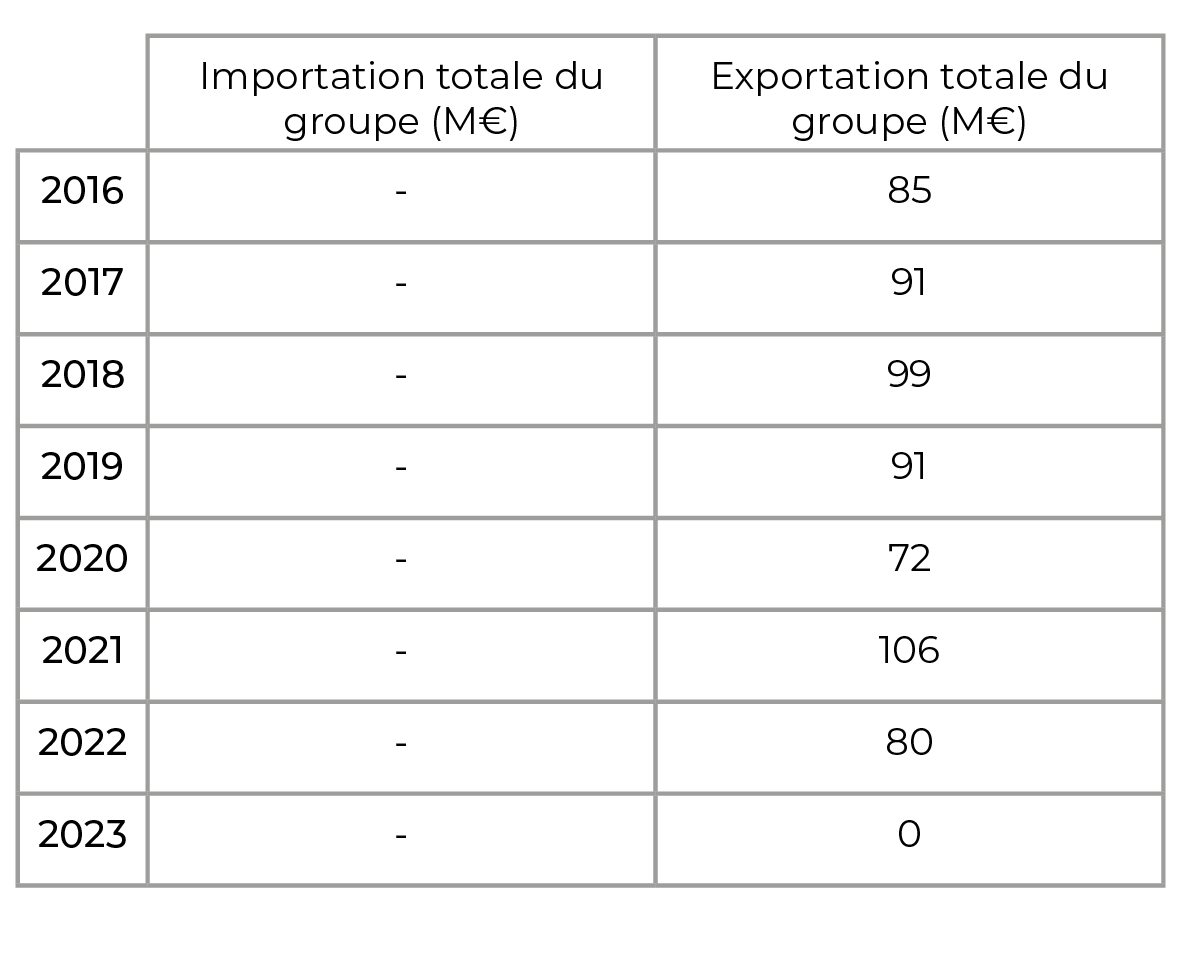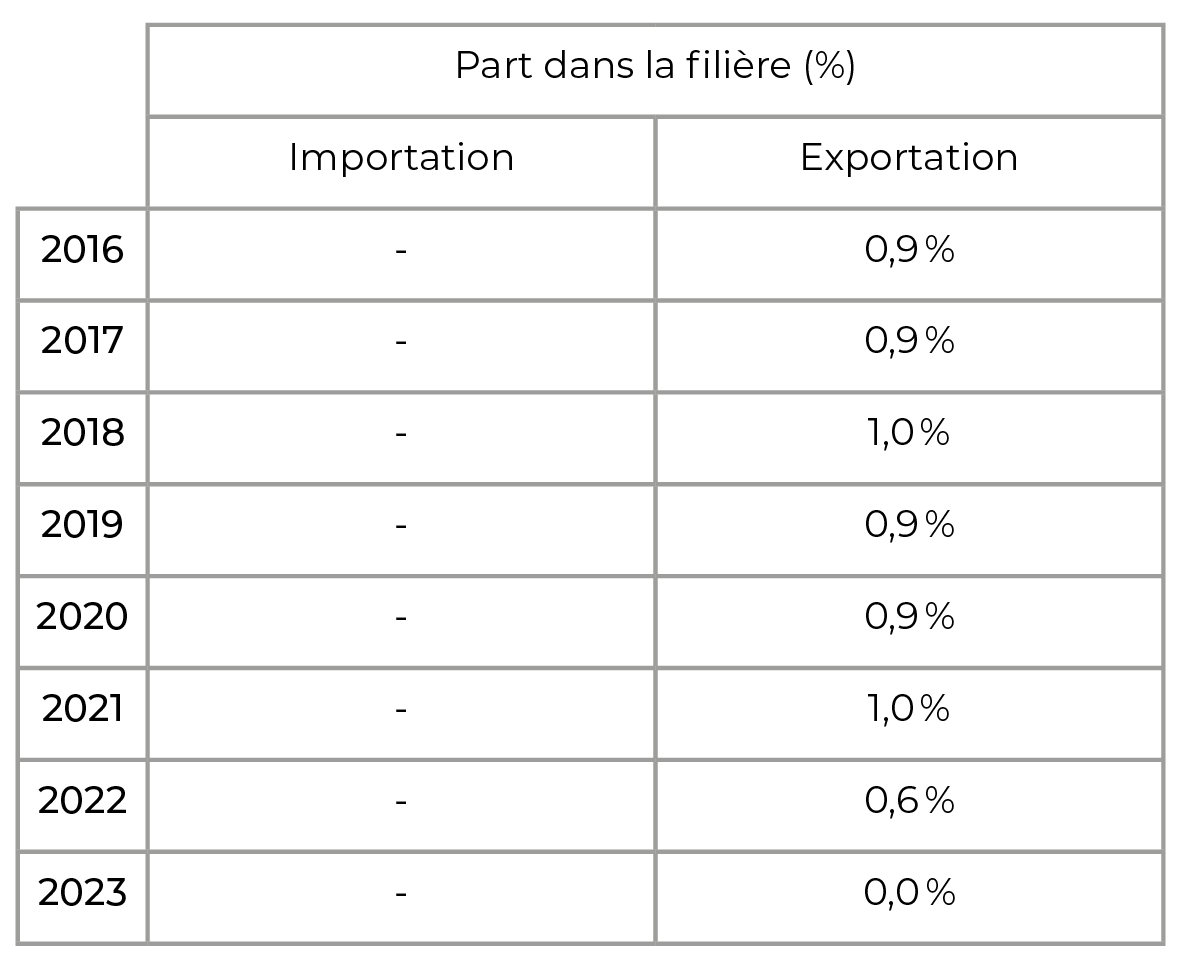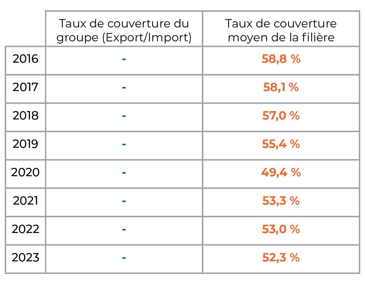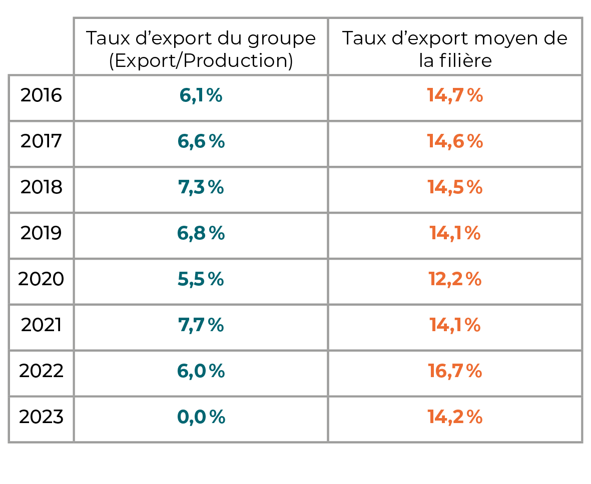 Le taux d’export est le ratio export sur production. Il met en évidence la propension à exporter du groupe. Le taux d’export n’est pas pertinent pour les commerces qui sont considérés comme un intermédiaire.