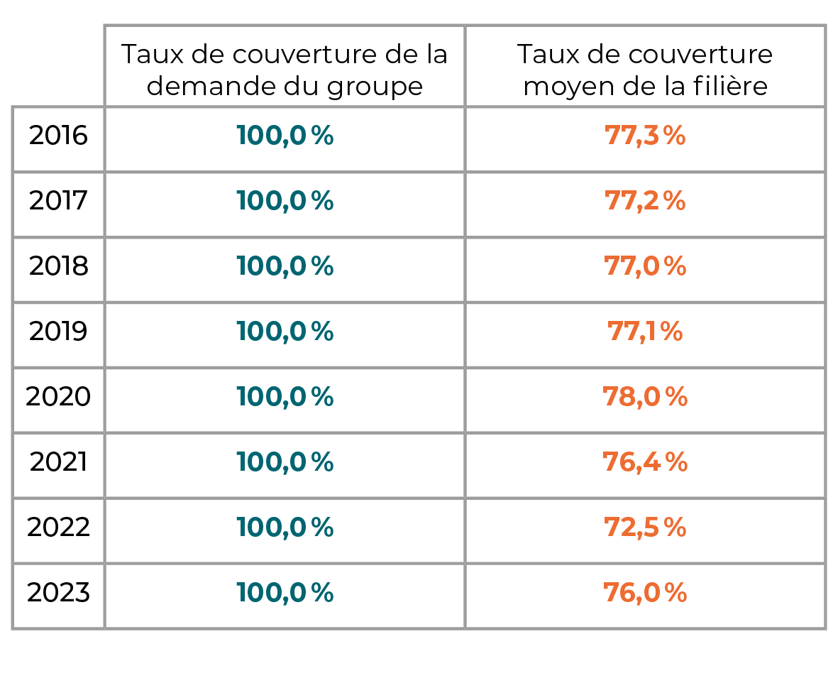 Le taux de couverture de la demande par l’offre nationale indique la part du marché intérieur couverte par la production nationale. Par exemple, si le taux d’import est de 20% alors le taux de couverture de la demande par l’offre nationale est de 80%.