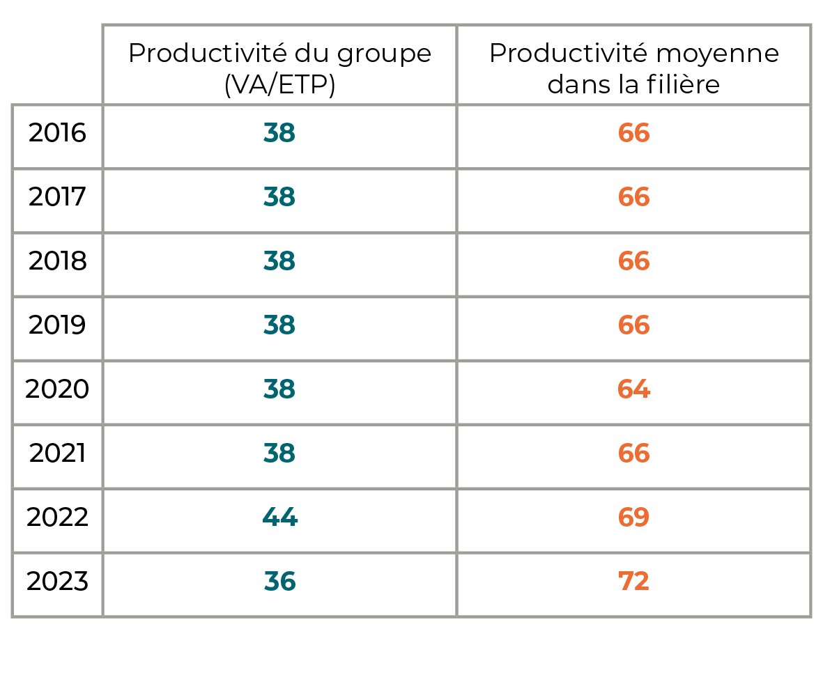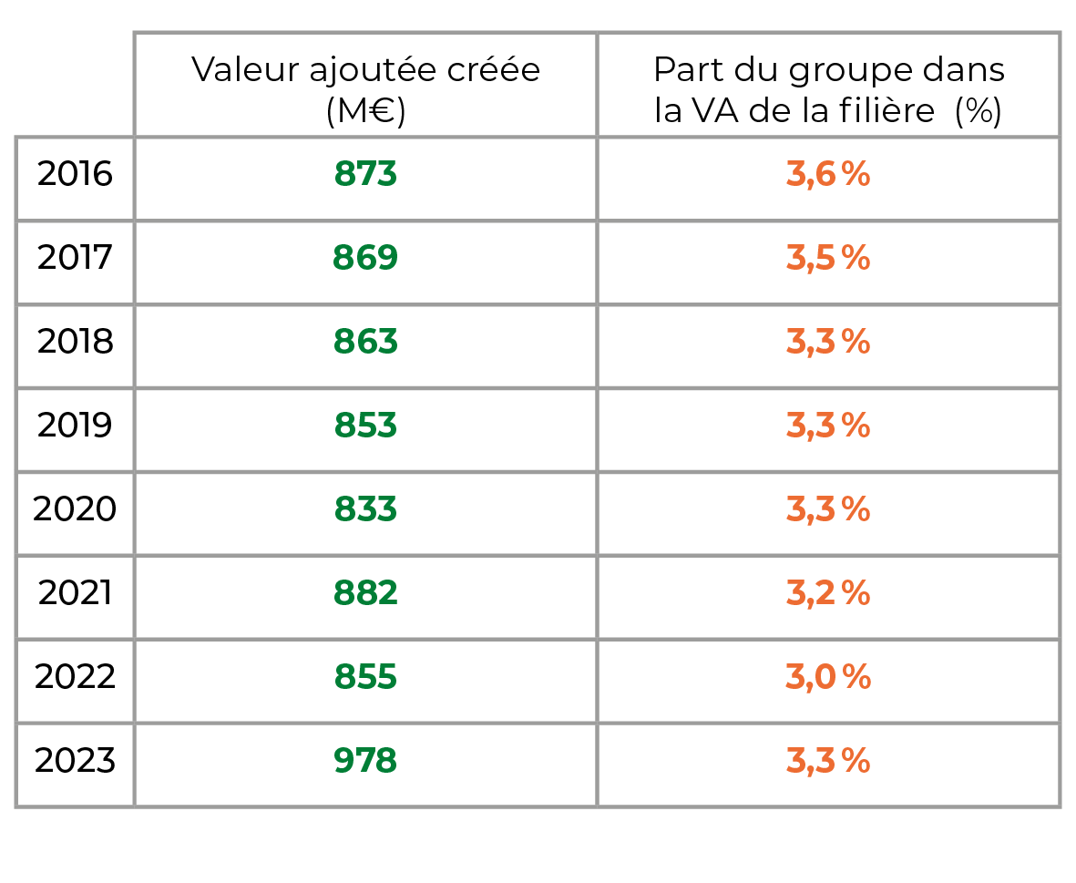 La forte productivité apparente du travail (VA/ETP) de ce groupe provient de la particularité de la production de bois. En effet, ne sont recensés en ETP que les propriétaires forestiers privés « professionnels », bien moins nombreux que l’ensemble des propriétaires dont la production de bois n’est pas la profession principale.